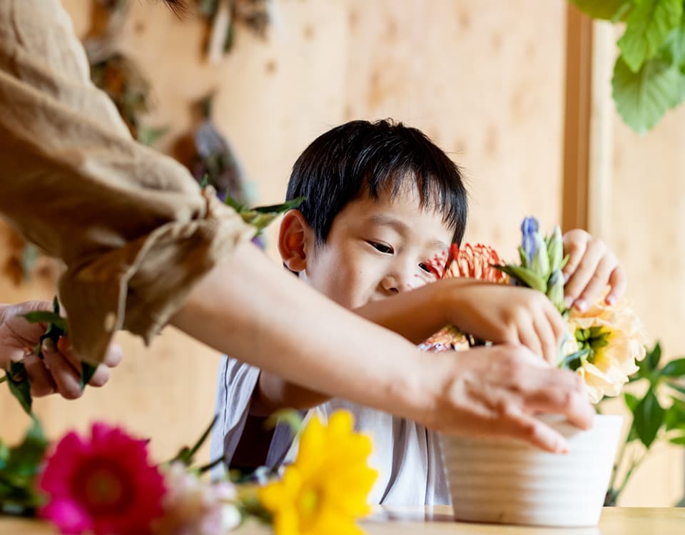季節のお花を自由に選んで創るお子さま向けの教室「花育」を開催しています(対象年齢3歳~中学生)。ご予約は、ネットショップよりお願いいたします。